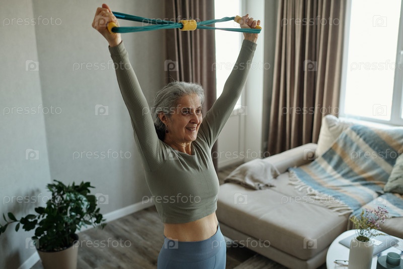 Пожилая женщина практикует йогу и растяжки дома