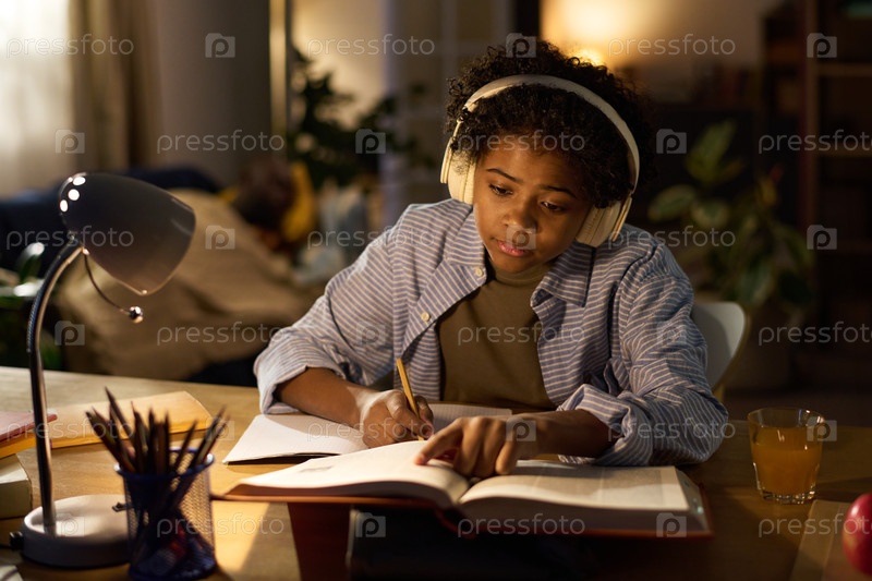 Молодая девушка с наушниками учится под светом лампы