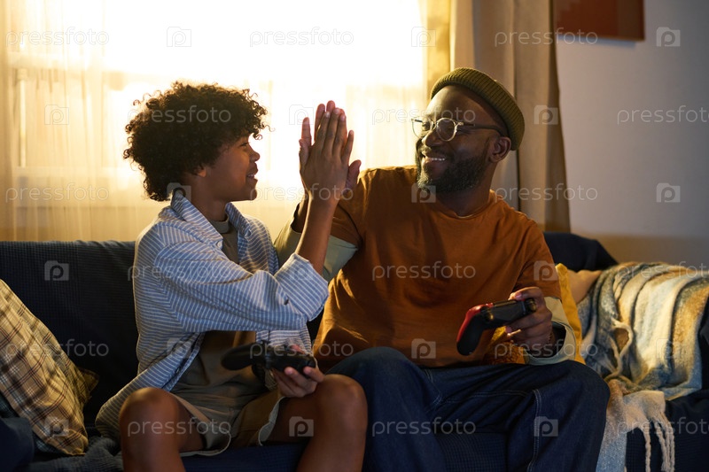 Отец и сын играют в видеоигры вместе на диване