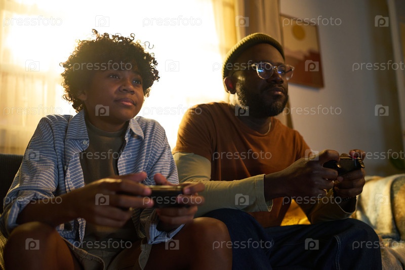 Афроамериканский отец и сын играют в видеоигры вместе