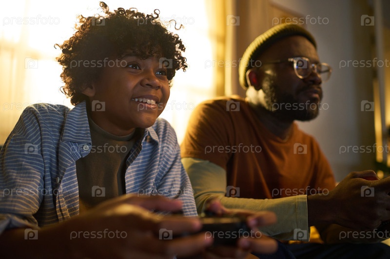 Отец и сын сидят вместе, играя в видеоигры