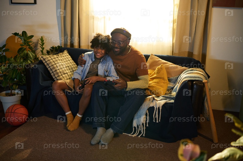 Улыбающаяся семья сидит на диване в уютной гостиной