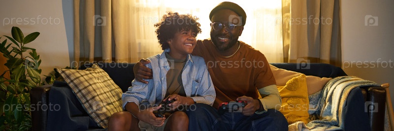 Отец и сын улыбаются, играя в видеоигры