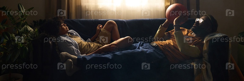 Расслабление на диване с футболом рядом со светом окна
