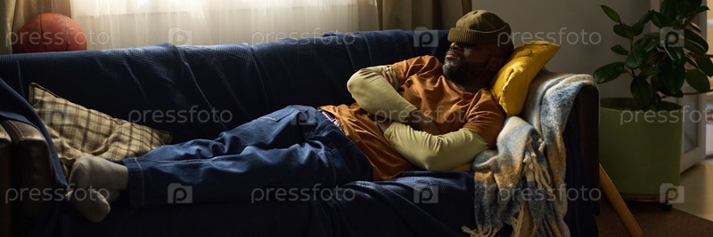 Отдыхающий афроамериканец лежит на диване