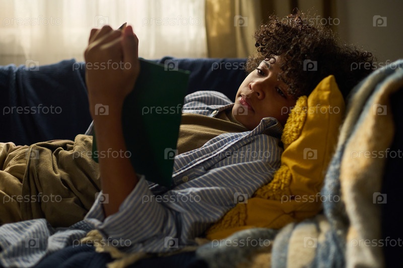 Расслабление в помещении на диване, чтение книги вечером