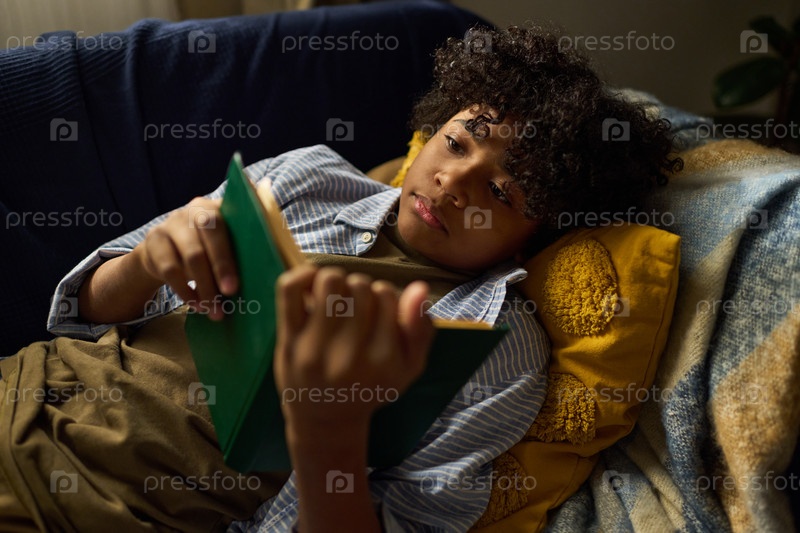 Мальчик читает книгу, отдыхая на диване