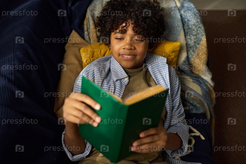Улыбающийся мальчик отдыхает на диване и читает книгу