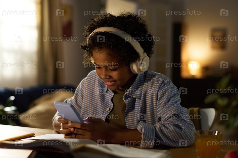 Афроамериканский ребенок, использующий смартфон с наушниками