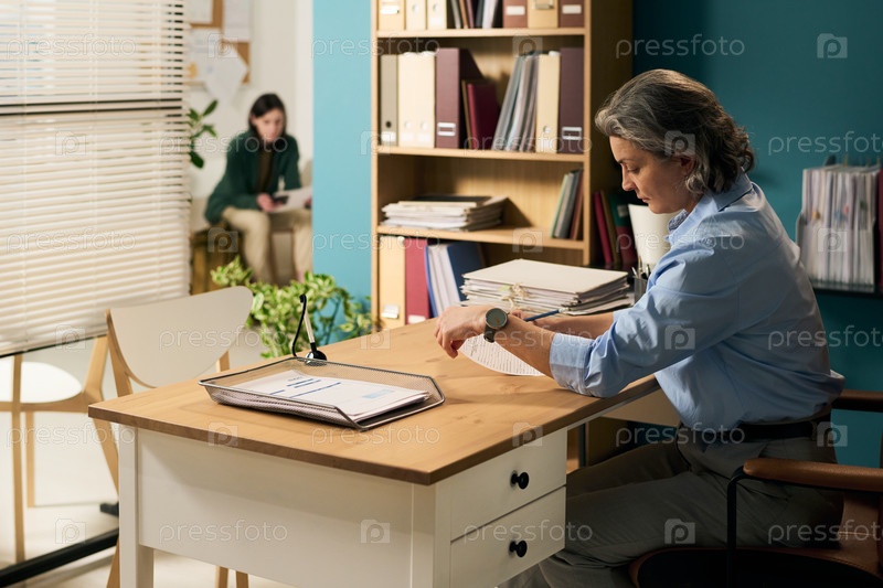 Работающая женщина среднего возраста, просматривающая документы социальных служб за рабочим столом