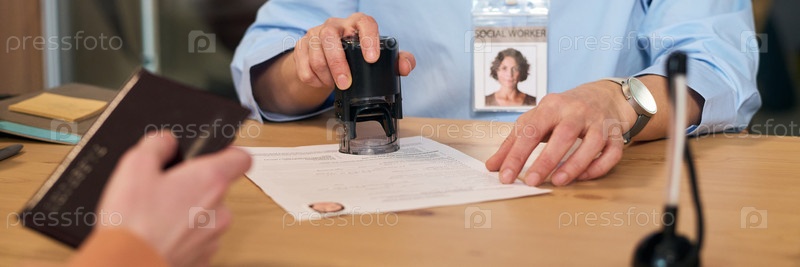 Штампирование документа во время встречи социальных служб с женщиной-работницей среднего возраста