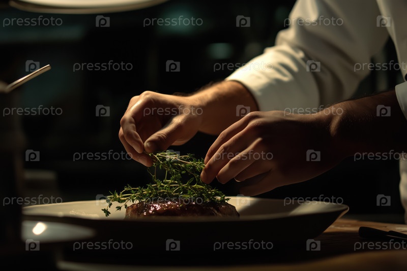 Шеф, украшающий блюдо свежими травами в тускло освещенной кухне