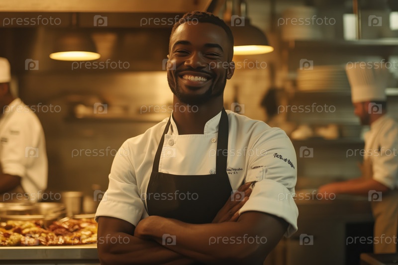 Улыбающийся афроамериканский шеф-повар в оживленной кухне ресторана