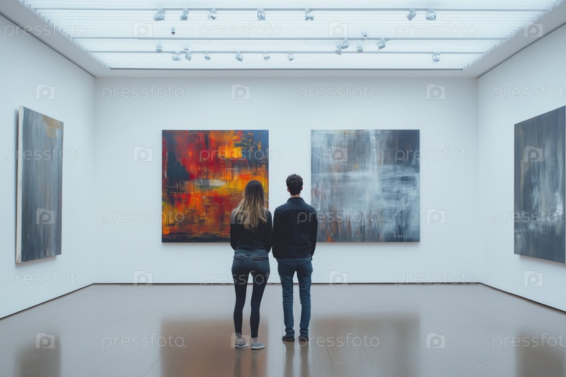 Посетители просматривают абстрактные картины в художественной галерее