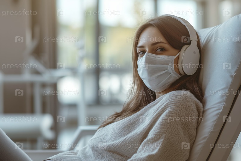 Портрет женщины с маской и наушниками, отдыхающей дома