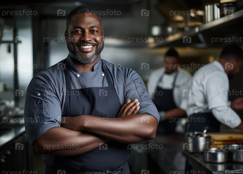 Улыбающийся шеф-повар стоит на профессиональной кухне