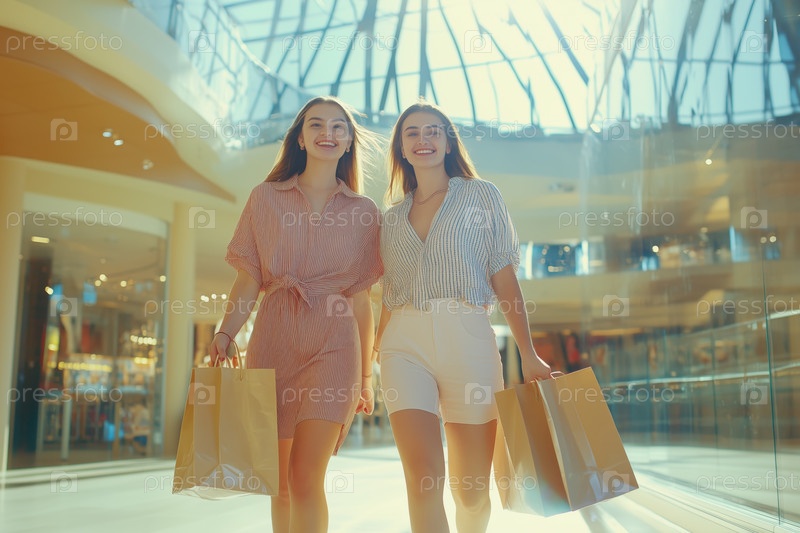 Две женщины делают покупки в современном торговом центре со стеклянной крышей