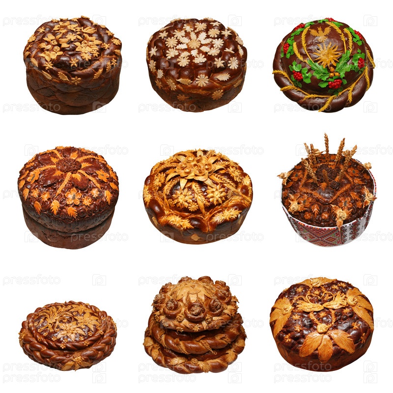 Ассортимент традиционного праздничного украинского хлеба на белом фоне