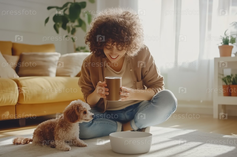 Наслаждаться утренним напитком с очаровательным питомцем в помещении