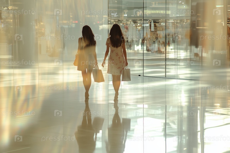 Женщины, делающие покупки в современном стеклянном торговом центре во время золотого часа