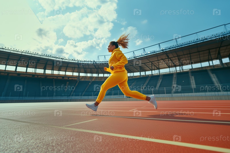 Бегущая женщина тренируется на трассе в пустом стадионе Sunrise