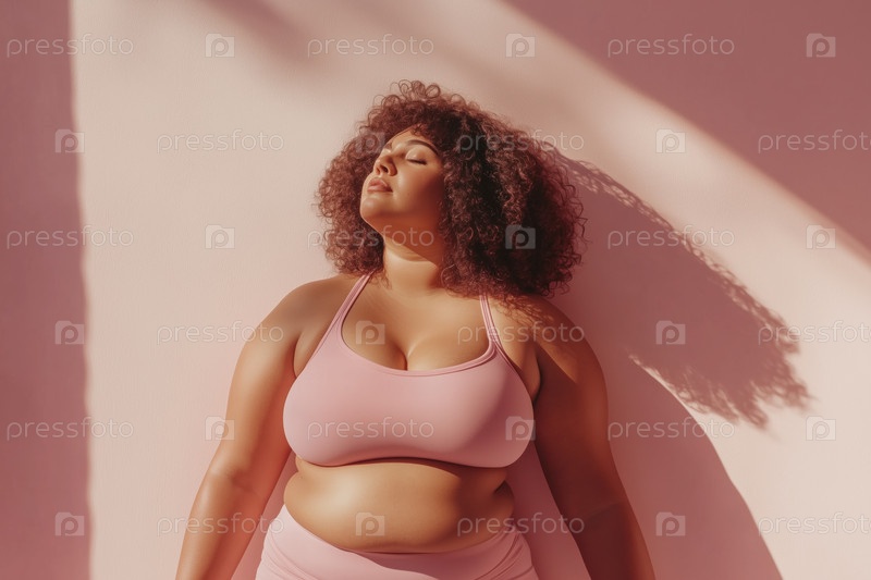 Уверенно позируя против светло-розовой стены в розовом наряде