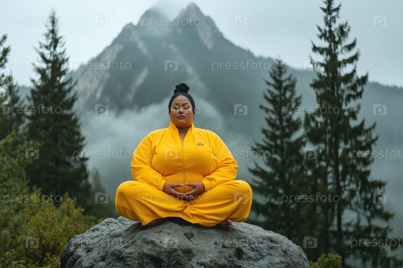 Медитирующая женщина в желтом спортивном костюме в горном лесу