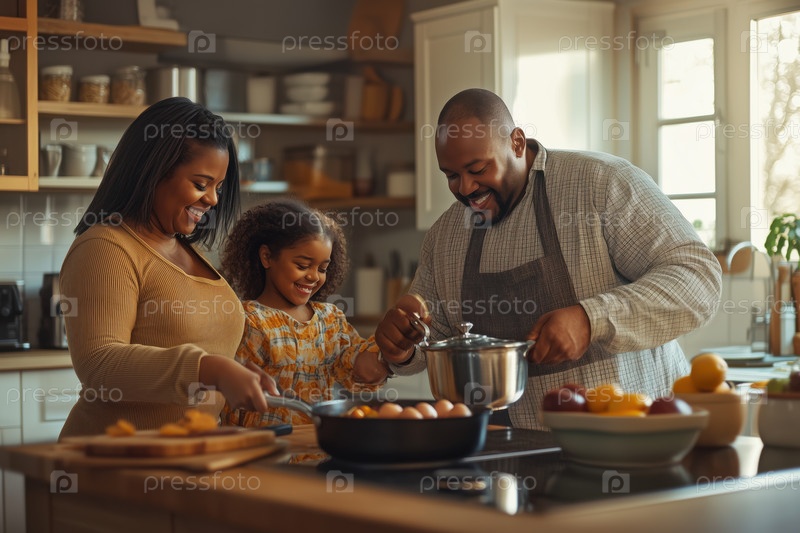 Улыбающаяся семья готовит завтрак вместе на кухне