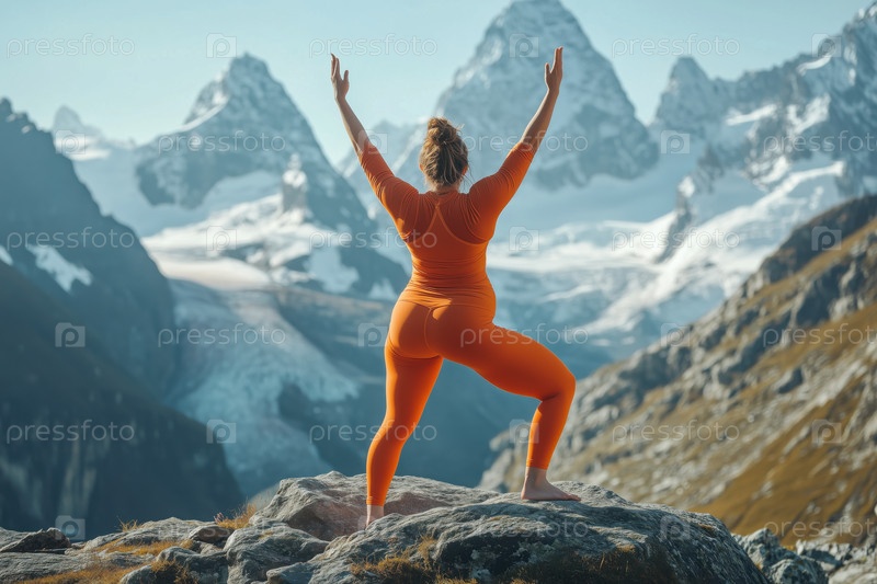 Женщина, практикующая йогу в окружении снежных гор