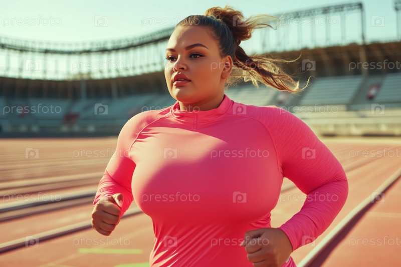 Женщина бегает по трассе на спортивном стадионе