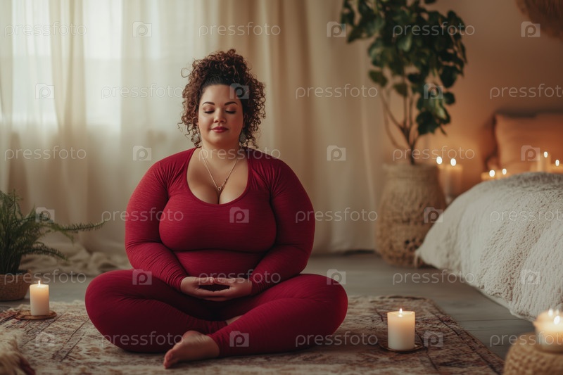 Медитирующая женщина, окруженная зажженными свечами в уютном интерьере