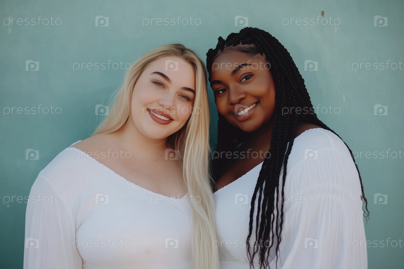 Портрет двух улыбающихся женщин, позирующих на красной стене