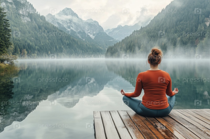Медитация на доке с видом на тихое горное озеро