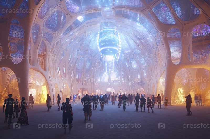 Просветленная толпа ходит внутри футуристической купольной структуры