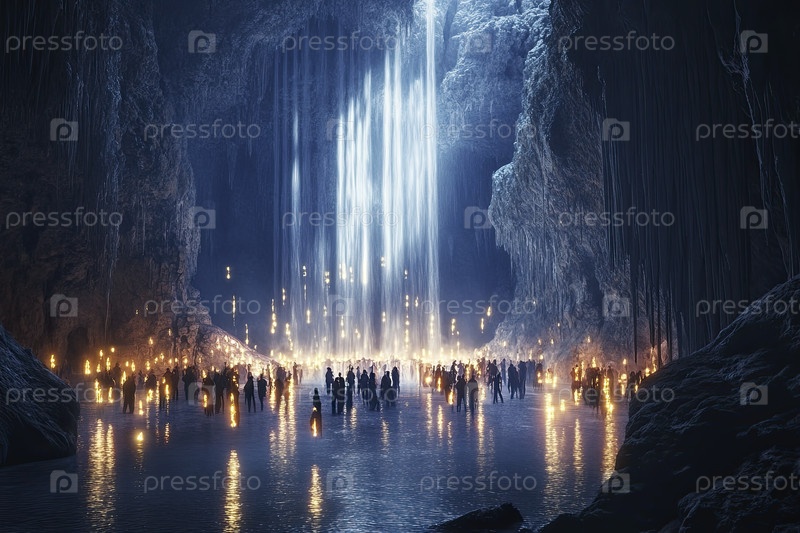 Собрание людей под величественным светящимся водопадом