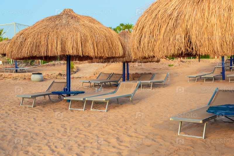 Сламчатые зонтики с шезлонгами на берегу Красного моря в зоне пляжного отдыха отеля