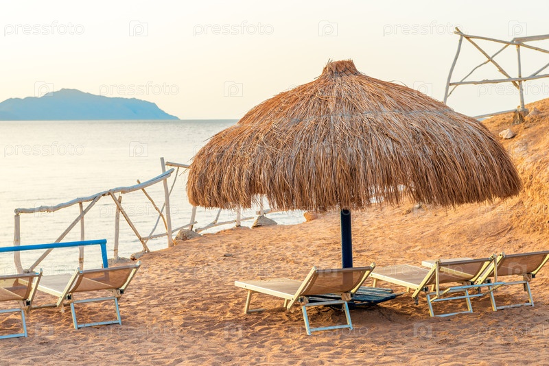 Соломенный зонтик с шезлонгами на берегу Красного моря