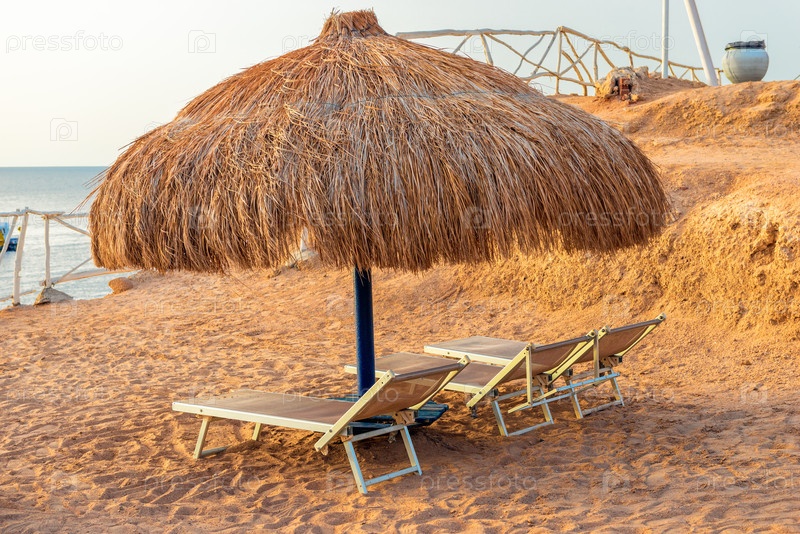 Соломенный зонтик с шезлонгами на берегу Красного моря