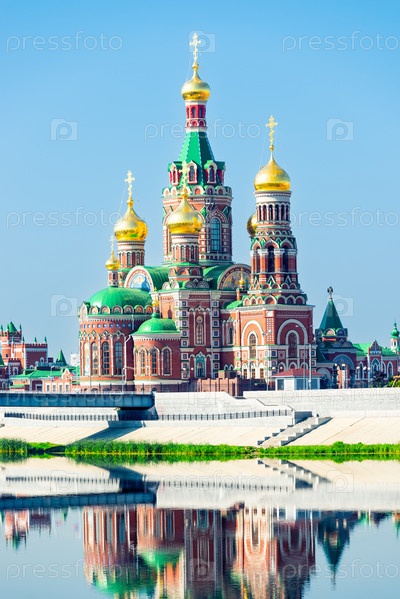 Живописный собор Благовещения Пресвятой Девы Марии в Йошкар-Оле на берегу реки.Россия