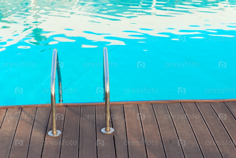 Стальные хромные перила бассейновой лестницы с прозрачной лазурной водой