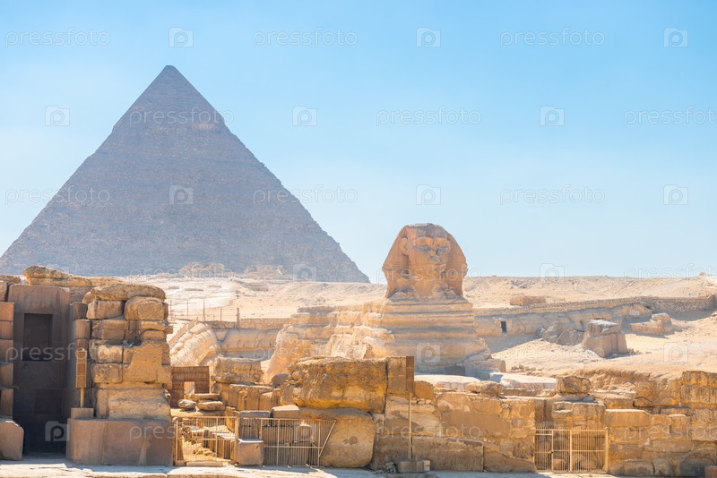 Величественный египетский сфинкс на фоне древних пирамид под палящим солнцем пустыни Сахара