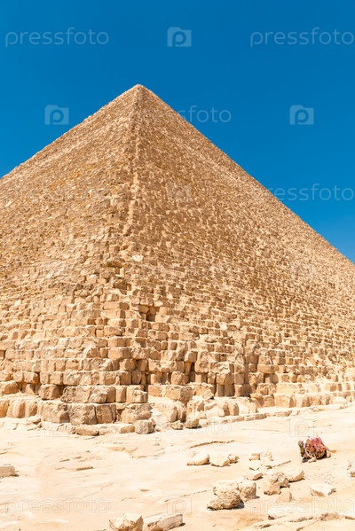 Разрушенный уголок величественной египетской пирамиды Хеопса под палящим солнцем пустыни Сахара