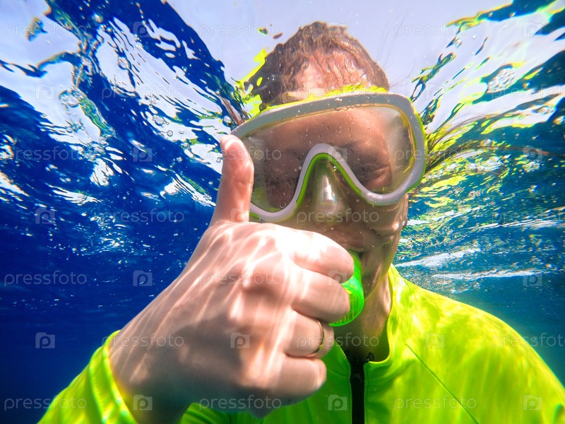 Женщина в маске и снорхеле поднимает большие пальцы под водой на море