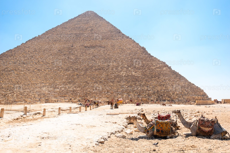 Верблюды Ладена отдыхают на фоне величественной египетской пирамиды Хеопса под палящим солнцем пустыни Сахара
