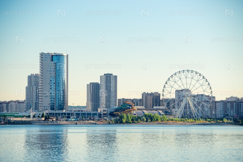 Вид на колесо обозрения и реку Казанка рано утром в городе Казань.Россия