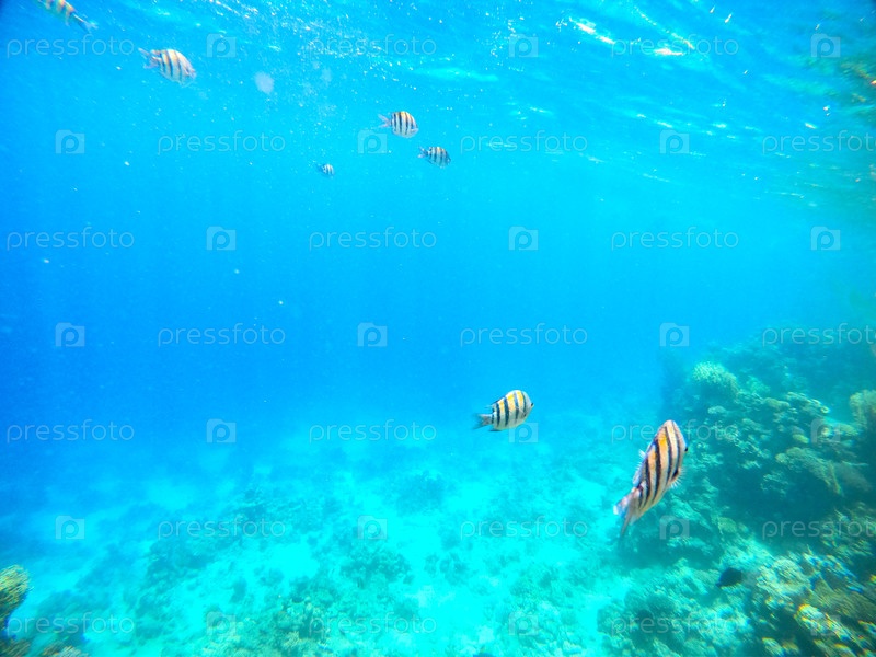 Тропическая рыба размером с сержанта плавает в глубоких голубых водах Красного моря, Египет