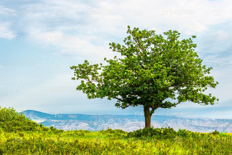 ландшафт с одиноким деревом на фоне горного пейзажа Северного Кавказа Дагестана. Россия