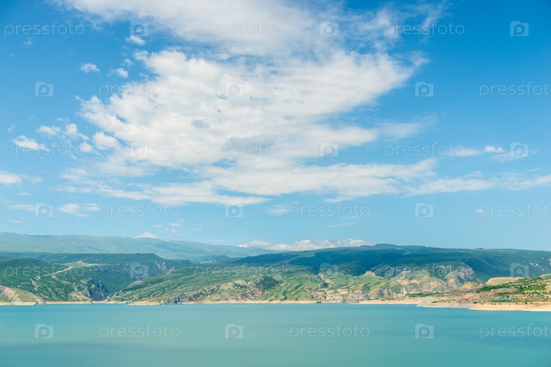 Красивый пейзаж горного водохранилища Чиркей с лазурьевой водой Северного Кавказа Дагестана.Россия