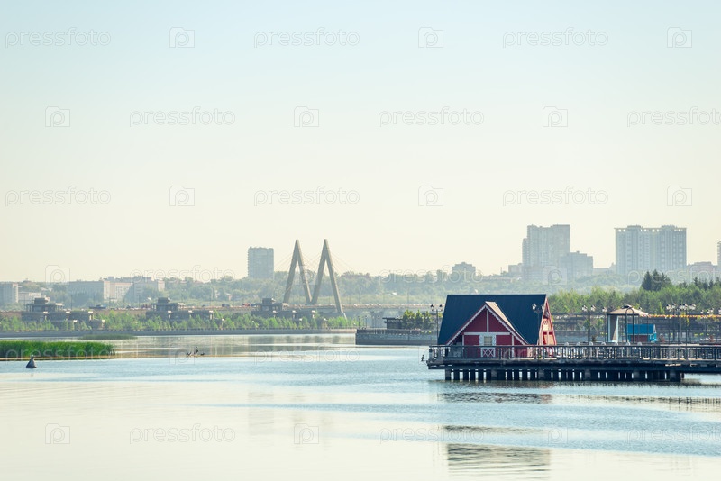 Живописный вид на реку Казанка, прибрежный дом и мост Тысячелетия