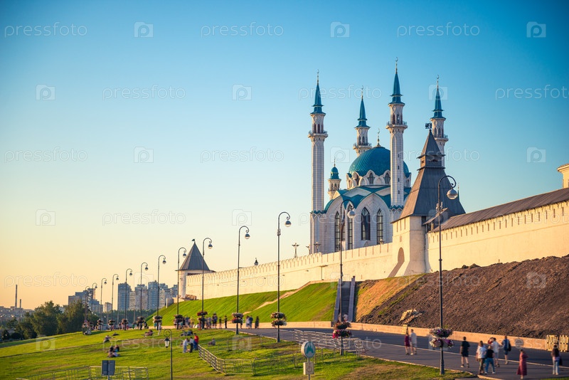 Живописный вид мечети Куль Шариф Казанского Кремля в лучах заходящего солнца.Россия